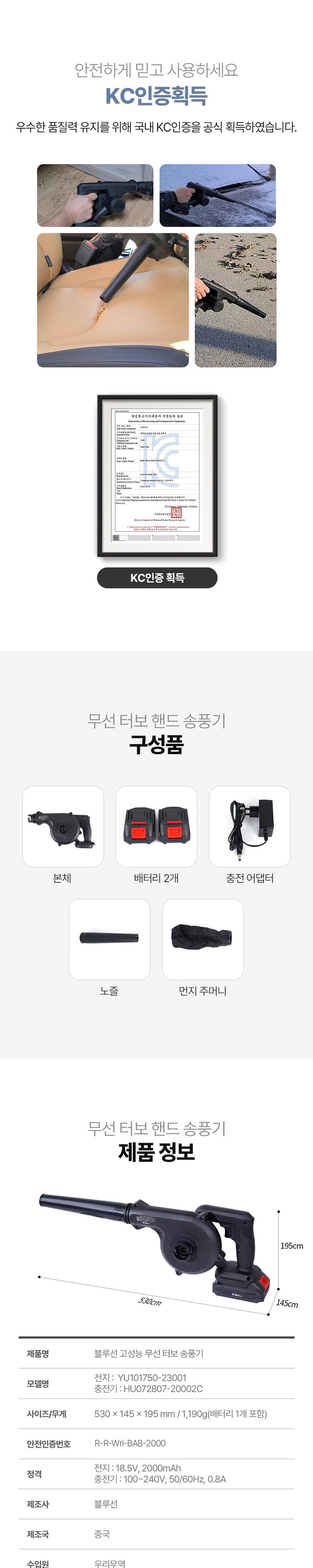| 품명 및 모델명 | 니가조화 무선 터보 휴대용 2000 mAh 충전기 포함 송풍기 | 인증/허가 사항 | R-R-Wri-BAB-2000 |