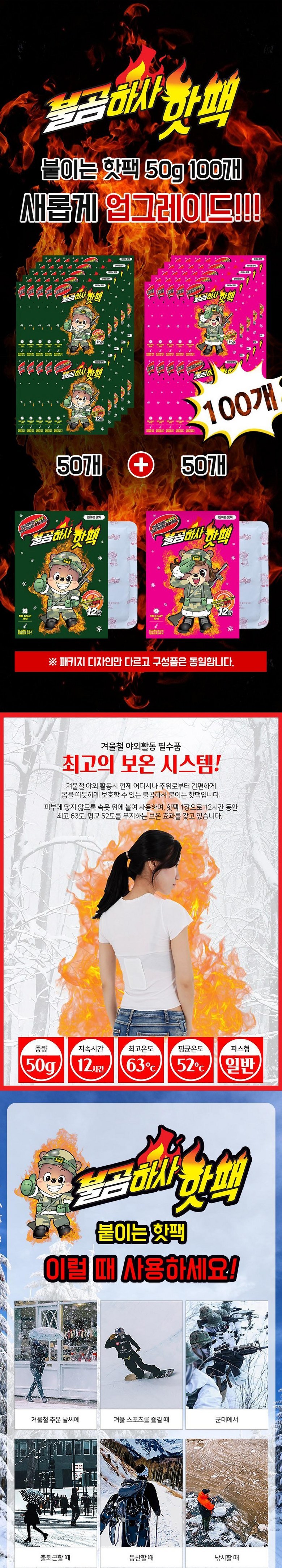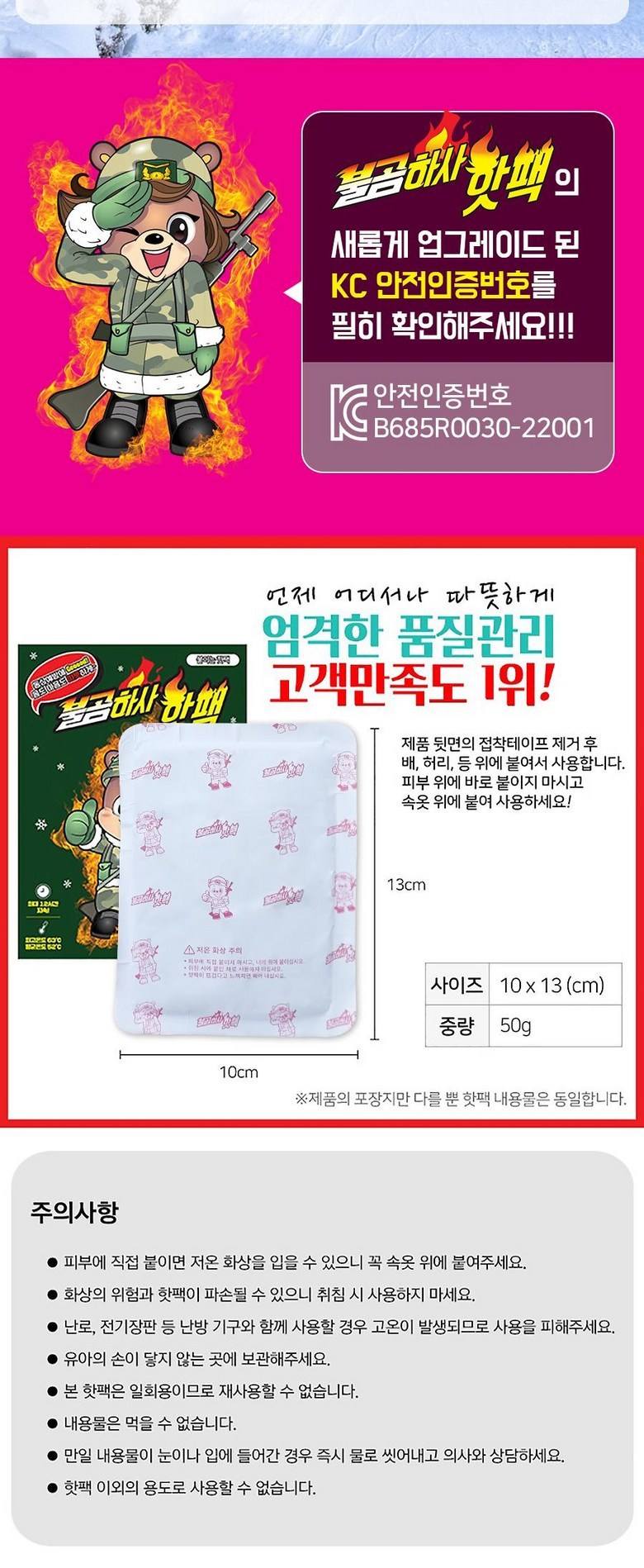 | 품명 및 모델명 | 불곰하사 파스형 붙이는 핫팩 | 인증/허가 사항 | B685R0030-22001 |