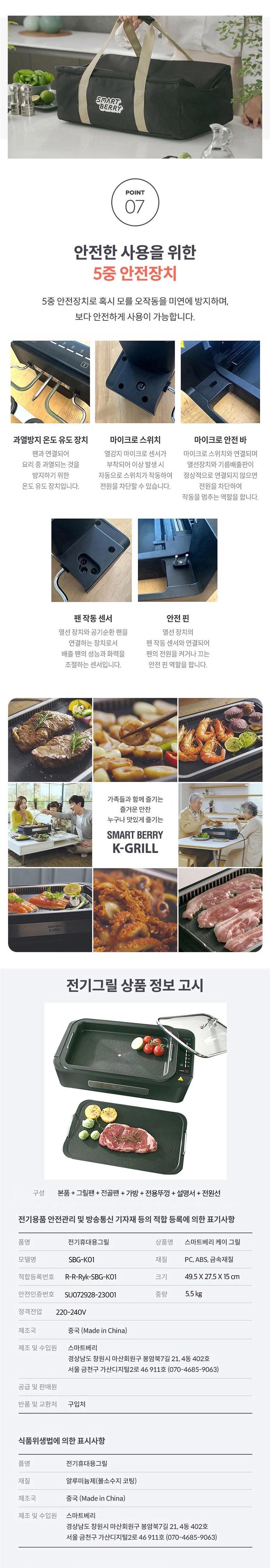 | 품명 및 모델명 | 전기 휴대용 그릴, SBG-K01 | KC 인증정보 | 전기용품 및 생활용품 안전관리법에 따른 KC인증 대상 |