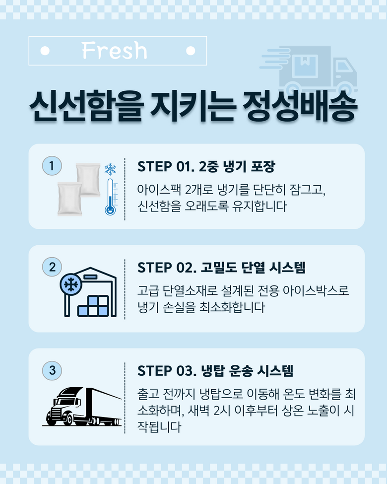 | 배송방법 | 신선/냉장/냉동 | 배송비 | 무료배송 · 도서산간 추가 배송비 - 제주 지역: 3,000원 - 도서산간 지역: 7,000원 |