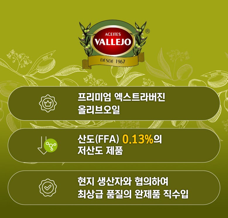 | 제품명 | 바예호 엑스트라버진 올리브오일 올리브유 1L PET | 식품의 유형 | 압착 올리브유 |