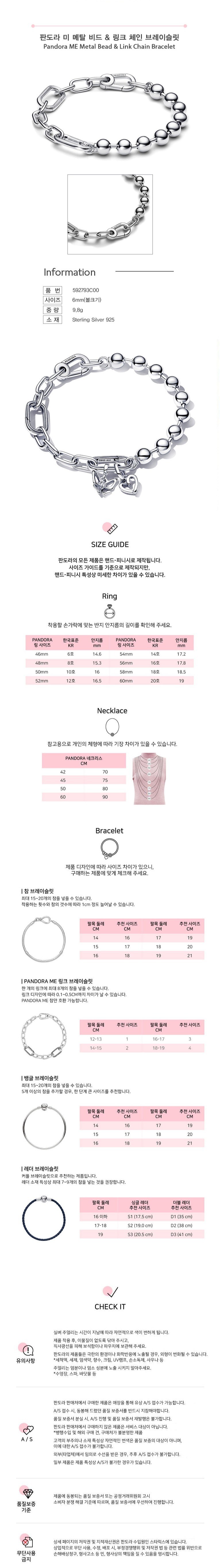 판도라 여성용 미 메탈 비드 앤 링크 체인 브레이슬릿 팔찌 592793C00 +쇼핑백+메시지카드+품질보증서(백화점A/S)