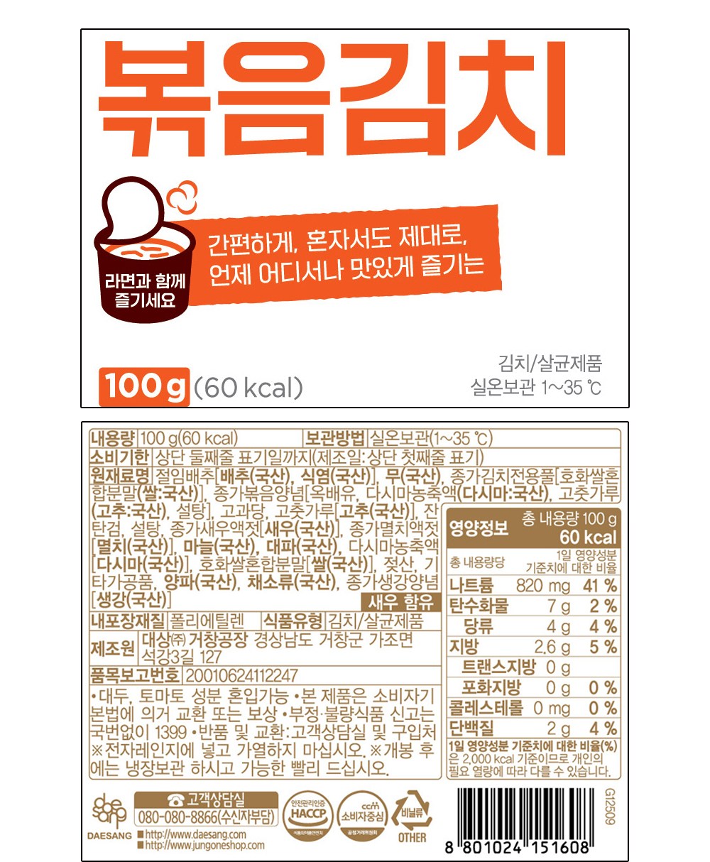 | 제품명 | 새콤달콤 맛있는 볶음김치 | 식품의 유형 | 컨텐츠 참조 |