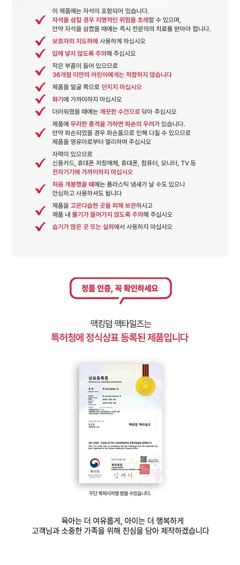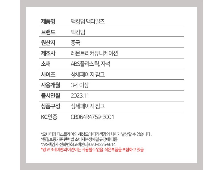 | 품명 및 모델명 | 맥킹덤 맥타일즈 | KC 인증정보 | CB064R4759-3001 |