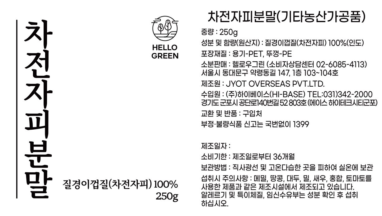 | 제품명 | 차전자피분말 | 식품의 유형 | 컨텐츠 참조 |