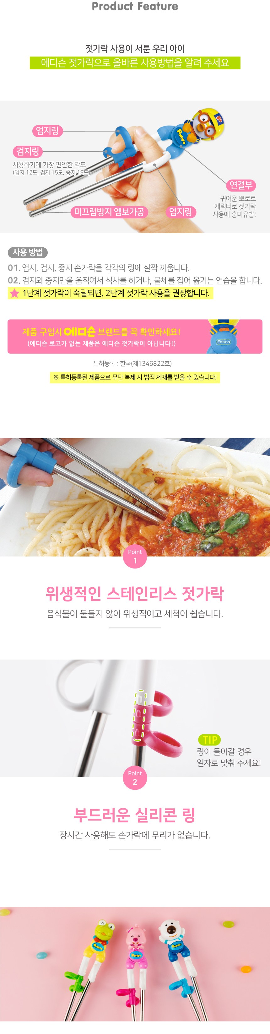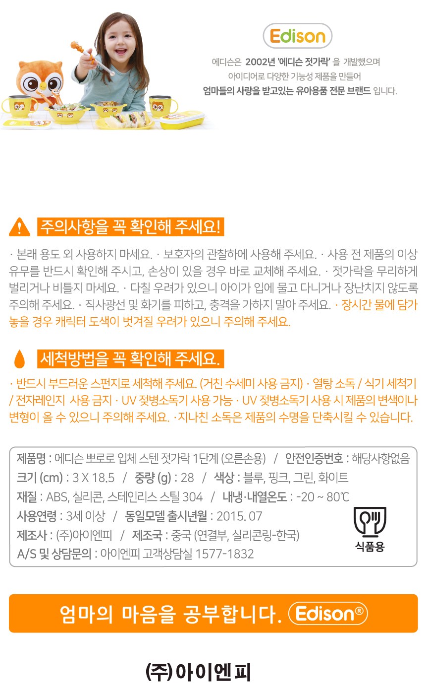 | 품명 및 모델명 | 에디슨 아동용 입체 스텐 교정젓가락 2종 세트 | 재질 | 컨텐츠 참조 |