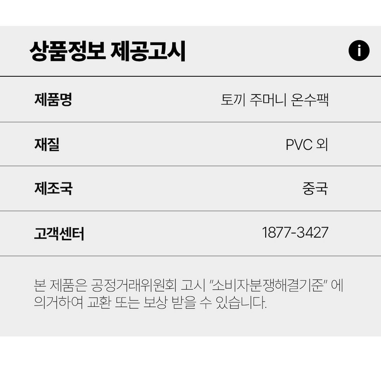 | 소비자상담 및 교환반품 문의 | 쿠팡고객센터 1577-7011 배송 및 환불/교환에 대한 문의는 마이쿠팡-고객센터 내 상담하기를 이용해주세요. | ||