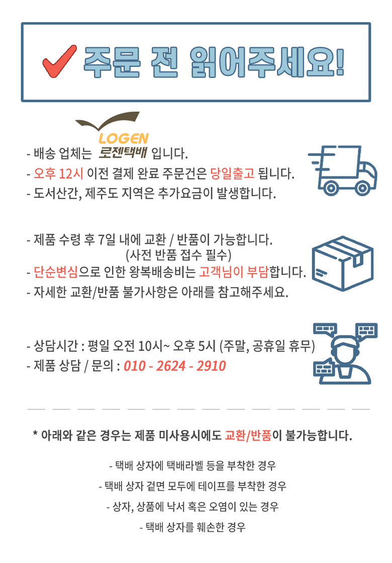 - ㆍ모니터 해상도의 차이로 인해 색상이나 이미지가 실제와 달라, 고객이 단순 변심으로 교환/반품을 무료로 요청하는 경우