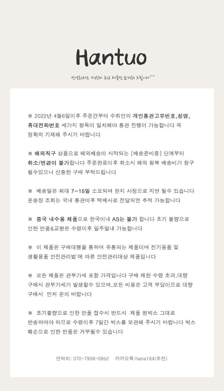 • 법규 개정에 따라 개인통관고유부호 검증 절차가 강화되었습니다. 결제 단계에서 받는 사람의 정보가 관세청 등록 정보 (성명, 휴대폰, 개인통관고유부호, 주소) 와 일치하는지 확인해주세요.