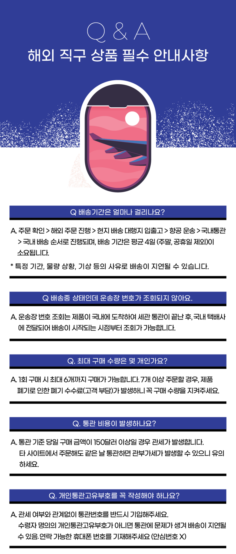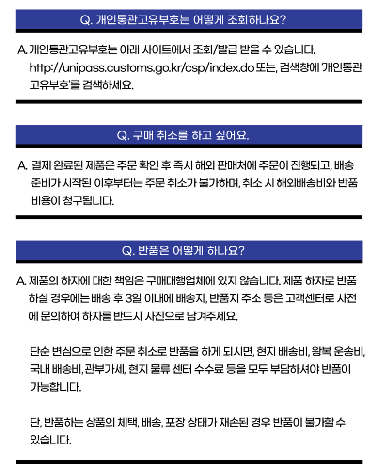- 법규 개정에 따라 개인통관고유부호 검증 절차가 강화되었습니다. 결제 단계에서 받는 사람의 정보가 관세청 등록 정보 (성명, 휴대폰, 개인통관고유부호, 주소) 와 일치하는지 확인해주세요.