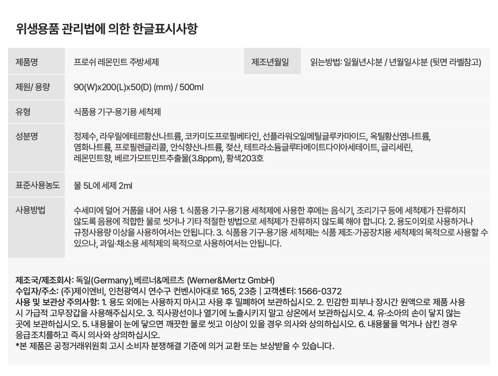 | 품명 및 모델명 | 프로쉬 레몬민트 주방세제 | 인증/허가 사항 | 위생용품 |