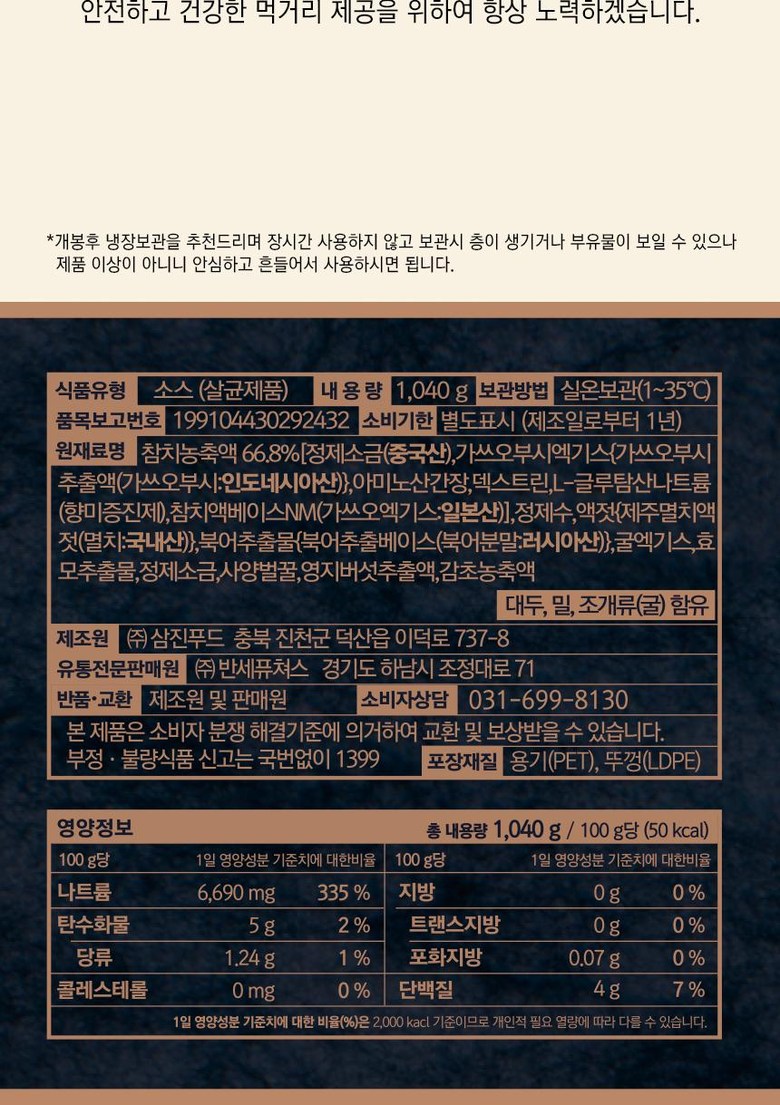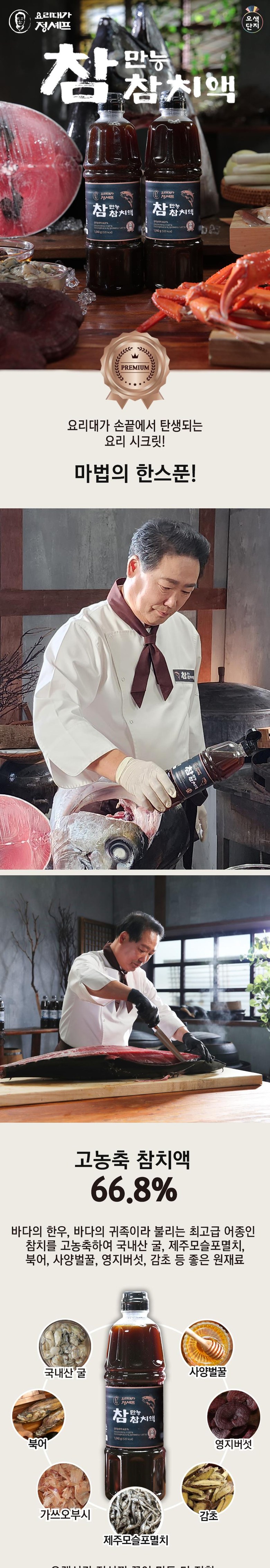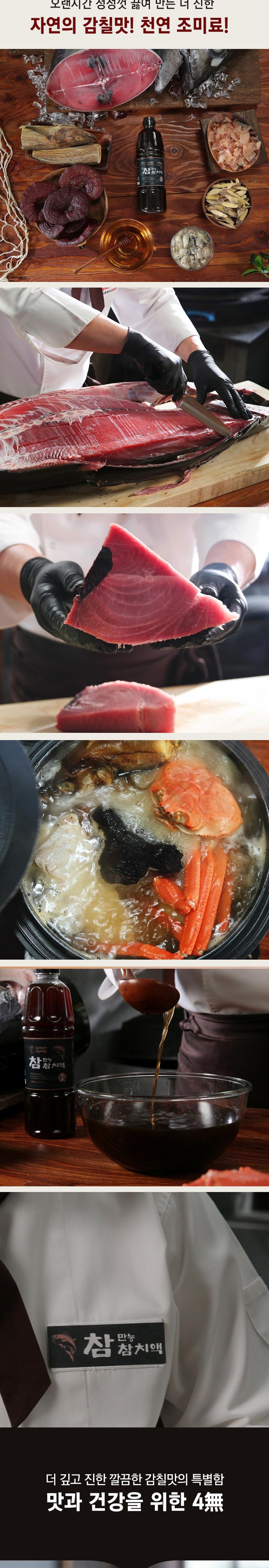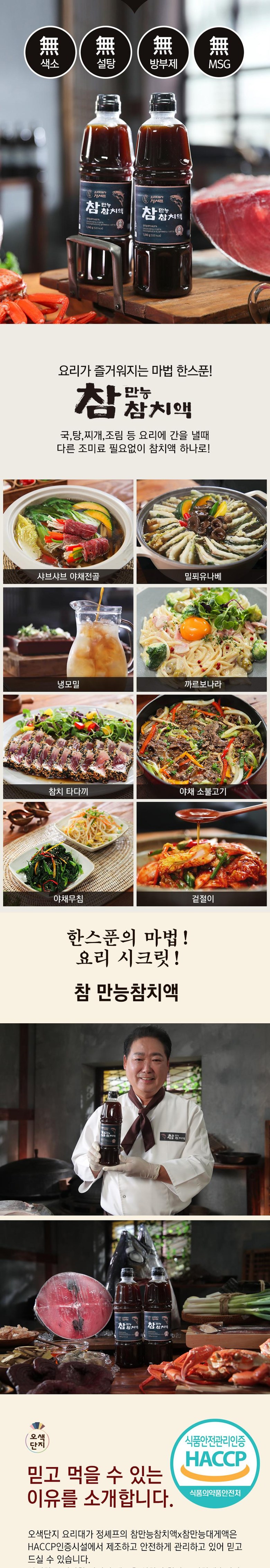 | 포장단위별 내용물의 용량(중량), 수량 | 참만능참치액 900ml(1,050g) x 2병 | 원재료명 및 함량 | 참치농축액66.8%[정제소금(소금,페로시안화칼륨/중국산),가쓰오부시엑기스{가쓰오부시추출액(가쓰오부시:인도네시아산)},아미노산간장,덱스트린,L-글루탐산나트륨(향미증진제),참치액베이스NM(가쓰오엑기스:일본산)],정제수,액젓{제주멸치액젓(멸치:국내산)},북어추출물{북어추출베이스(북어분말:러시아산)}2%,굴엑기스1%,효모추출물,정제소금,사양벌꿀0.1%,영지버섯추출액0.1%,감초농축액0.1% |
