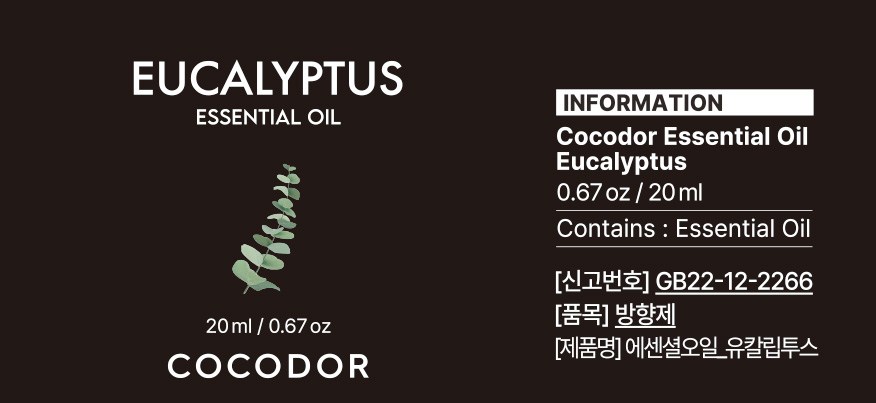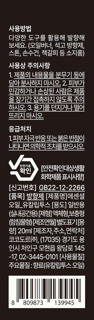 | 품목 및 제품명 | 방향제 / 에센셜오일_유칼립투스 | 용도(표백제의 경우 계열을 함께표시) 및 제형 | 일반용-실내공간용/비분사형-액체형,비분사형-보충형(함침물형) |