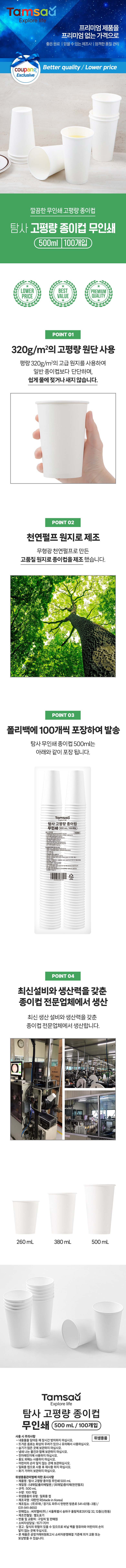 | 품명 및 모델명 | 탐사 고평량 종이컵 무인쇄 500ml, 100개입 | 인증/허가 사항 | 위생용품 |
