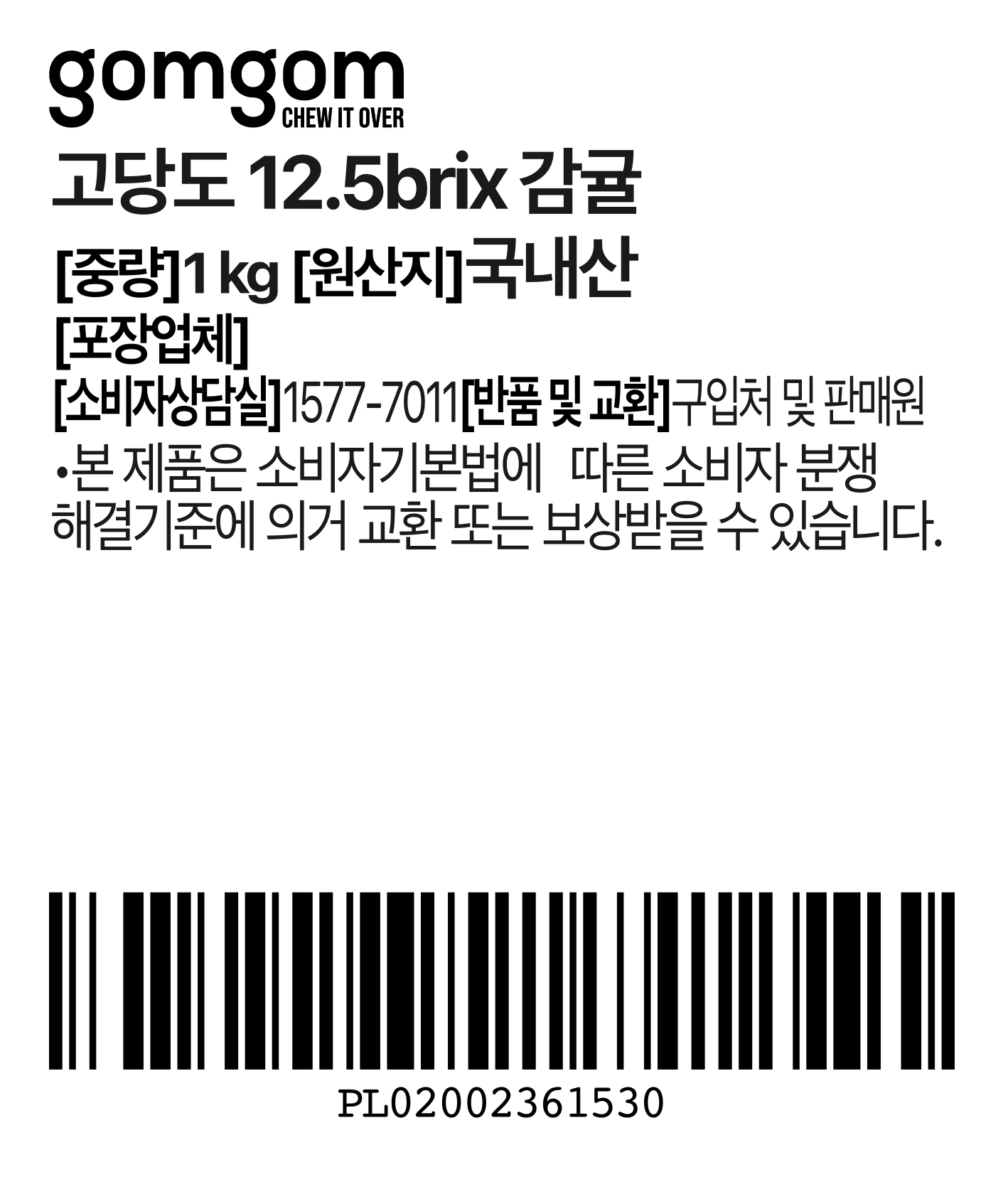 | 품목 또는 명칭 | 고당도 12.5brix감귤 | 포장단위별 내용물의 용량(중량),수량,크기 | 1kg x 1팩 |