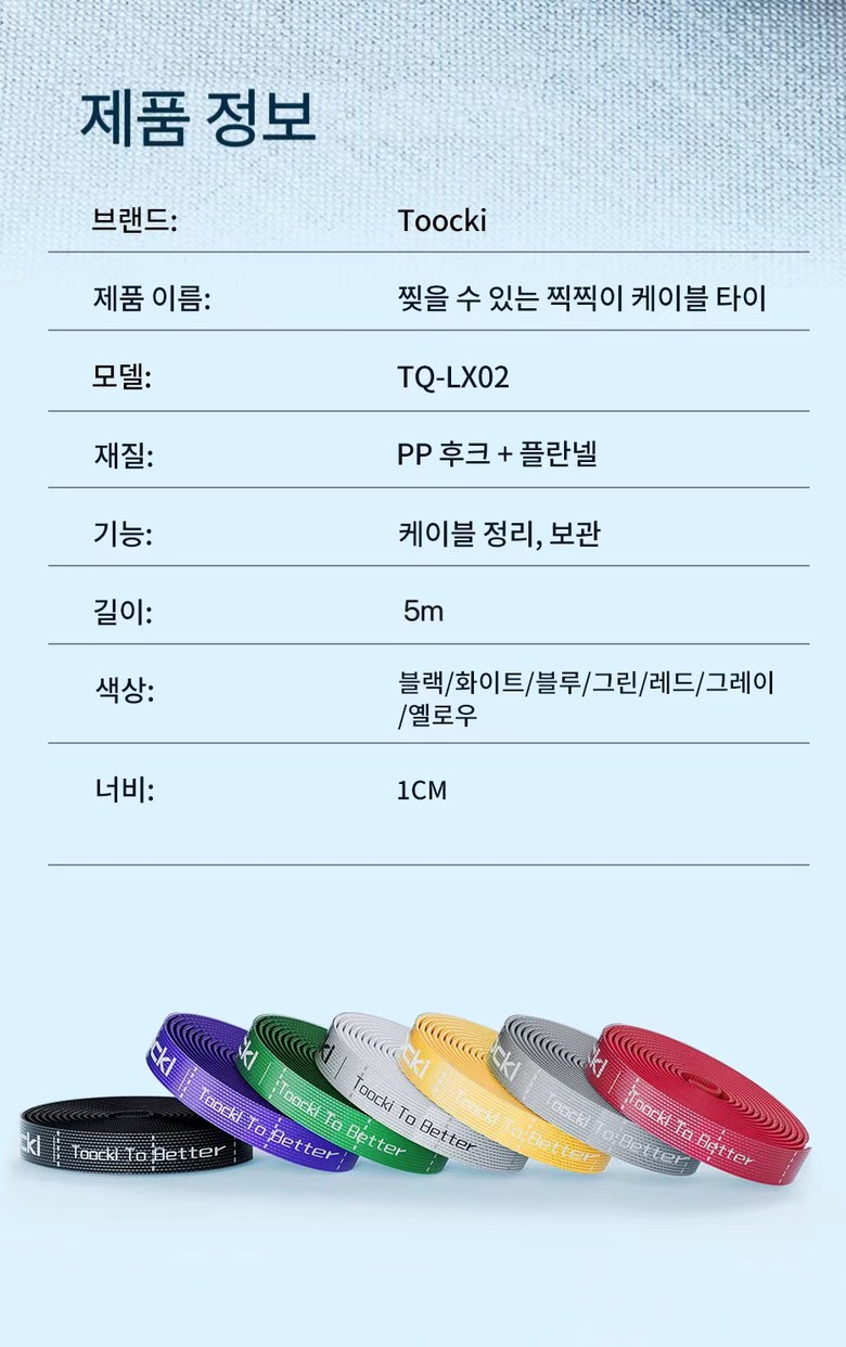 | 품명 및 모델명 | Toocki 손으로 컷팅 벨크로 찍찍이 케이블타이 | 인증/허가 사항 | 상품 상세페이지 참조 |