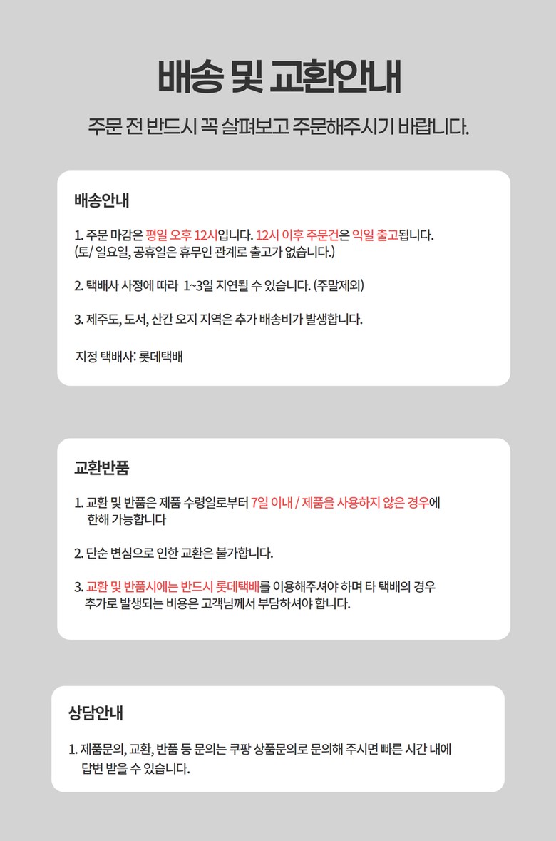 - ㆍ모니터 해상도의 차이로 인해 색상이나 이미지가 실제와 달라, 고객이 단순 변심으로 교환/반품을 무료로 요청하는 경우