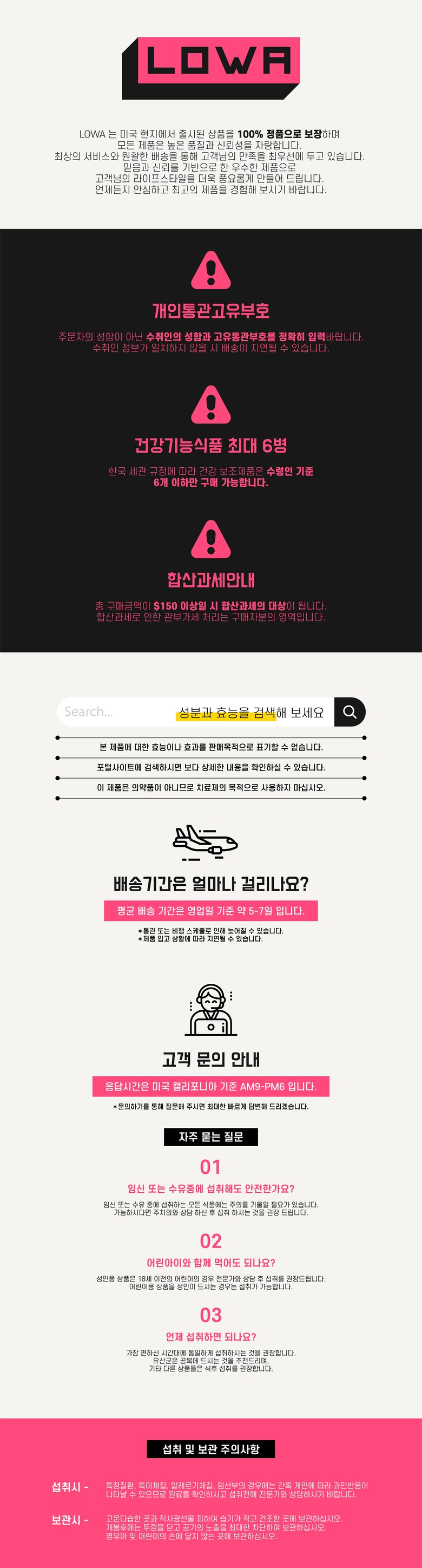- 법규 개정에 따라 개인통관고유부호 검증 절차가 강화되었습니다. 결제 단계에서 받는 사람의 정보가 관세청 등록 정보 (성명, 휴대폰, 개인통관고유부호, 주소) 와 일치하는지 확인해주세요.