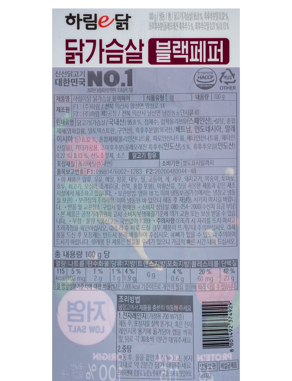 간편하게 조리 후 즐기는 하림이닭 닭가슴살 블랙페퍼예요. 쫄깃한 육질 속 고소한 육즙이 일품이죠. 결을 따라 쭉 찢어져 부드러운 식감을 즐기실 수 있답니다. 맛있게 조리하여 그대로 드시거나, 밥반찬이나 샐러드 등에 활용해보세요.