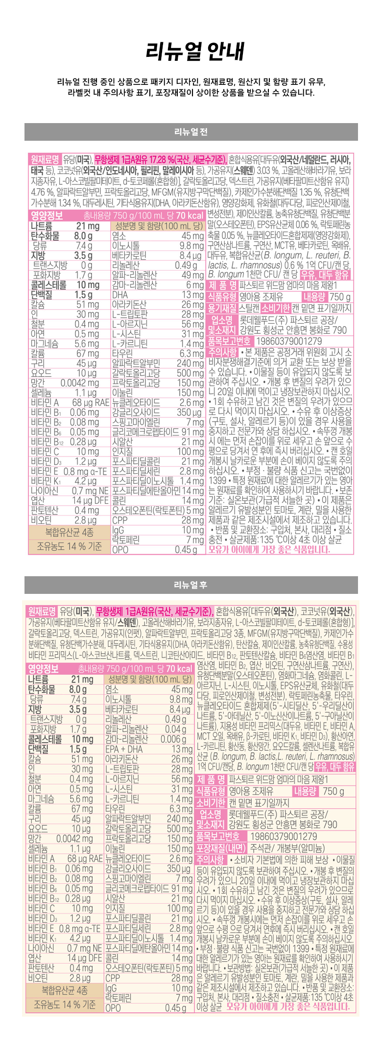 | 포장단위별 내용물의 용량(중량), 수량 | 750g, 3개 | 원재료명 및 함량 | 리뉴얼 전 : 컨텐츠 참조 / 리뉴얼 후 : 컨텐츠 참조 |