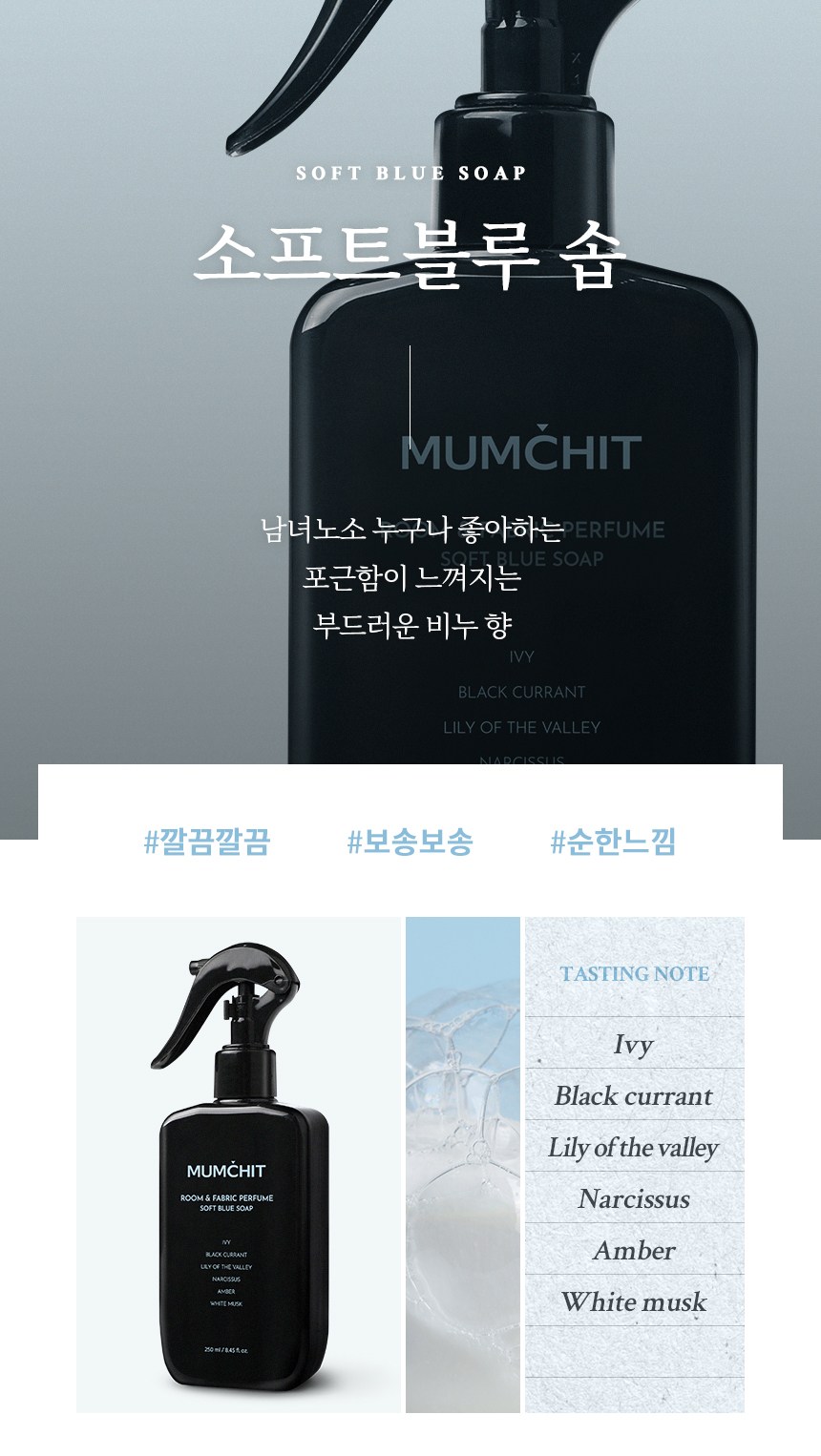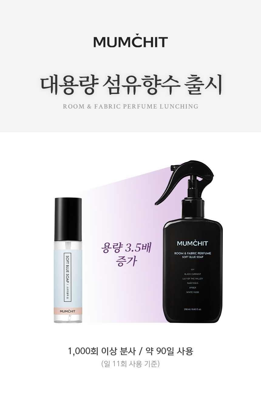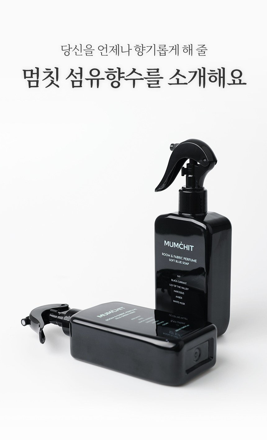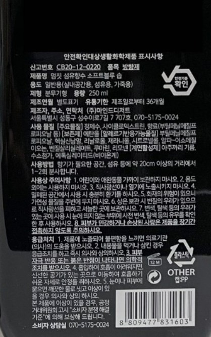 | 품목 및 제품명 | 방향제/멈칫 섬유향수 소프트블루솝 | 용도(표백제의 경우 계열을 함께표시) 및 제형 | 일반용-실내공간용-,일반용-섬유용-,일반용-가죽용-/분사형-분무기형 |