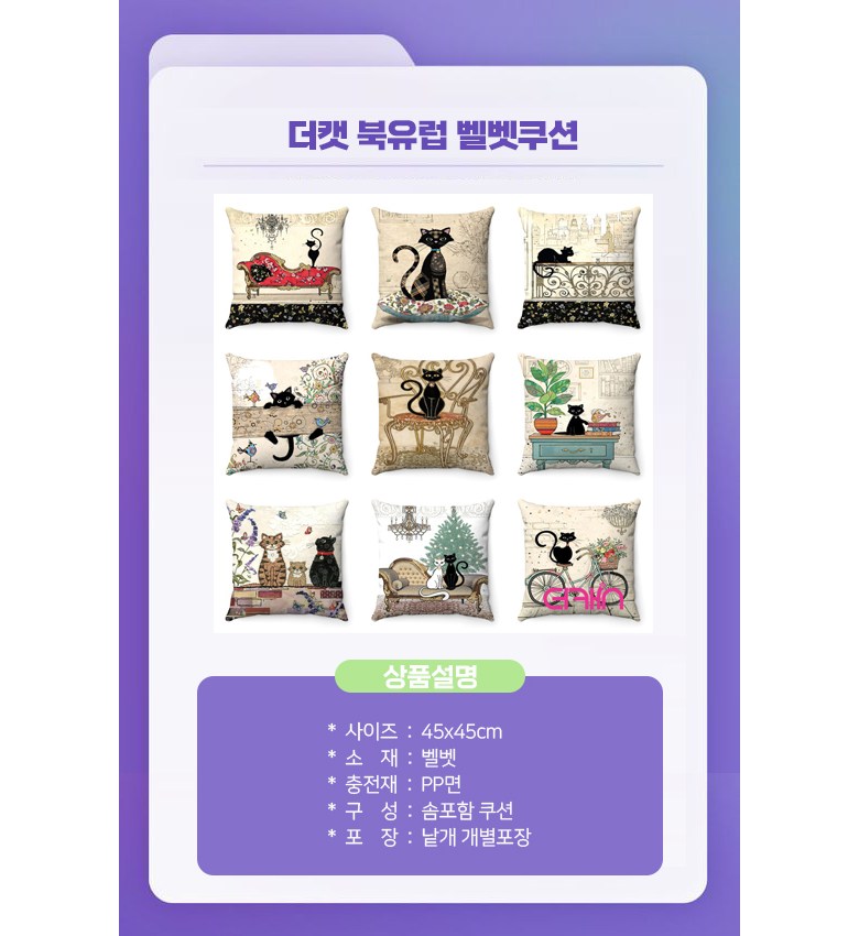 | 치수 | 45x45cm(커버)/50x50cm(솜) | 제품구성 | 쿠션커버+솜 |