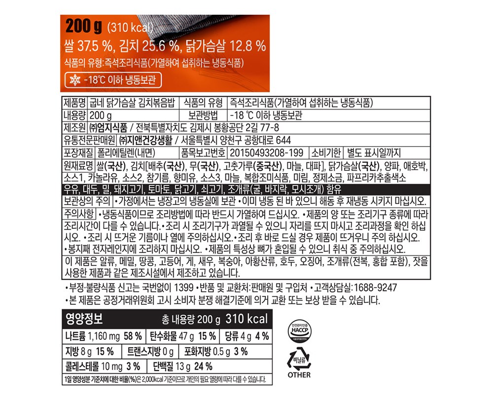 달콤한 풍미가 매력적인 닭가슴살 김치볶음밥이에요. 아삭한 김치와 각종 야채들이 어우러져 매콤한 감칠맛을 자아내는데요. 큼직하면서도 촉촉한 닭가슴살이 들어있어 부드럽게 씹힌답니다. 전자레인지나 프라이팬으로 손쉽게 조리할 수 있으니, 집이나 여행지에서 간편하게 즐겨보세요.