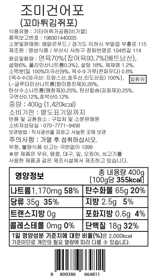| 포장단위별 내용물의 용량(중량), 수량 | 400g x 2개 | 원재료명 및 함량 | 컨텐츠 참조 |