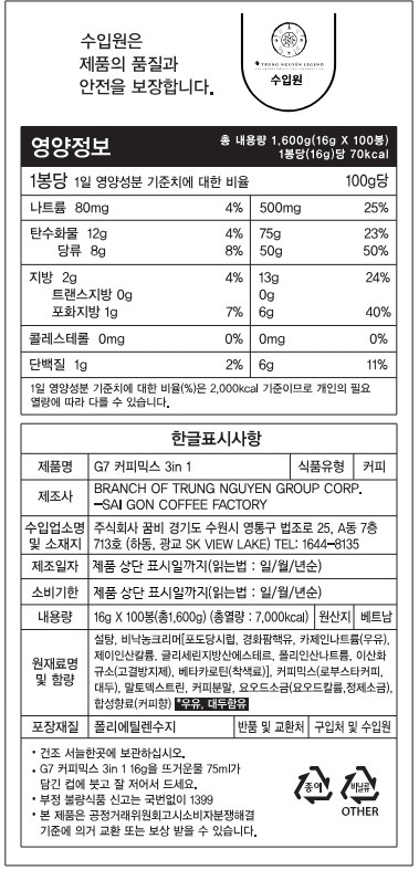 | 제품명 | G7 커피믹스 3 in 1 | 식품의 유형 | 컨텐츠 참조 |
