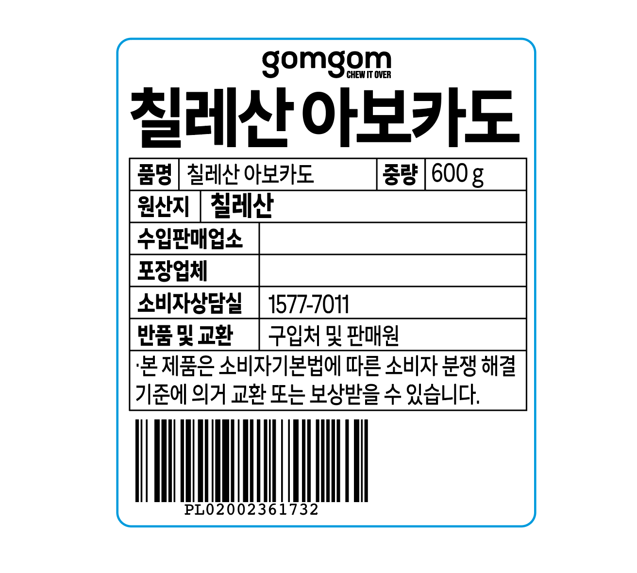 | 품목 또는 명칭 | 칠레산 아보카도 | 포장단위별 내용물의 용량(중량),수량,크기 | 600g x 1개 |