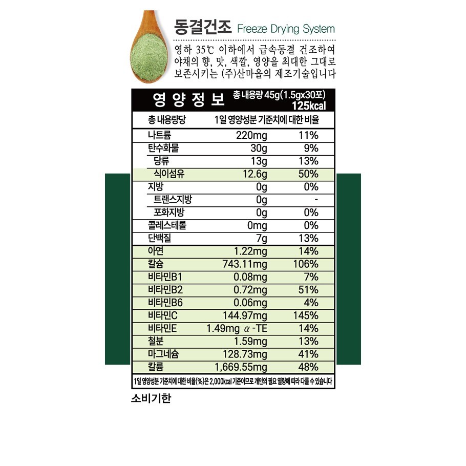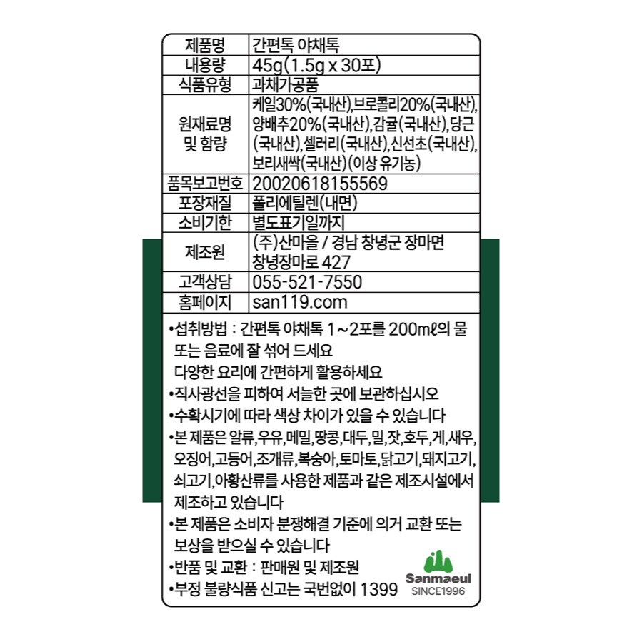 | 생산자 및 소재지 | (주)산마을 / 경상남도 창녕군 장마면 창녕장마로 427 | 제조연월일, 소비기한 또는 품질유지기한 | 소비기한(또는 유통기한) : 2026년 11월 05일 이거나 그 이후인 상품 제조년월일 : 2024년 11월 06일 이후인 제조상품 |