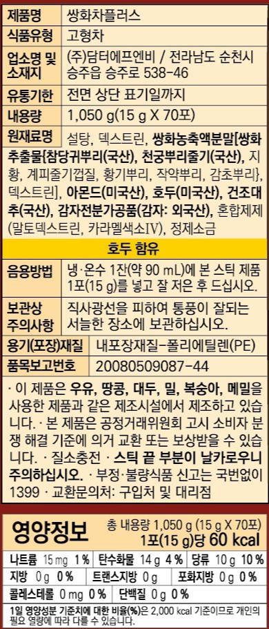 | 포장단위별 내용물의 용량(중량), 수량 | 15g x 140개,1개 | 원재료명 및 함량 | 컨텐츠 참조 |