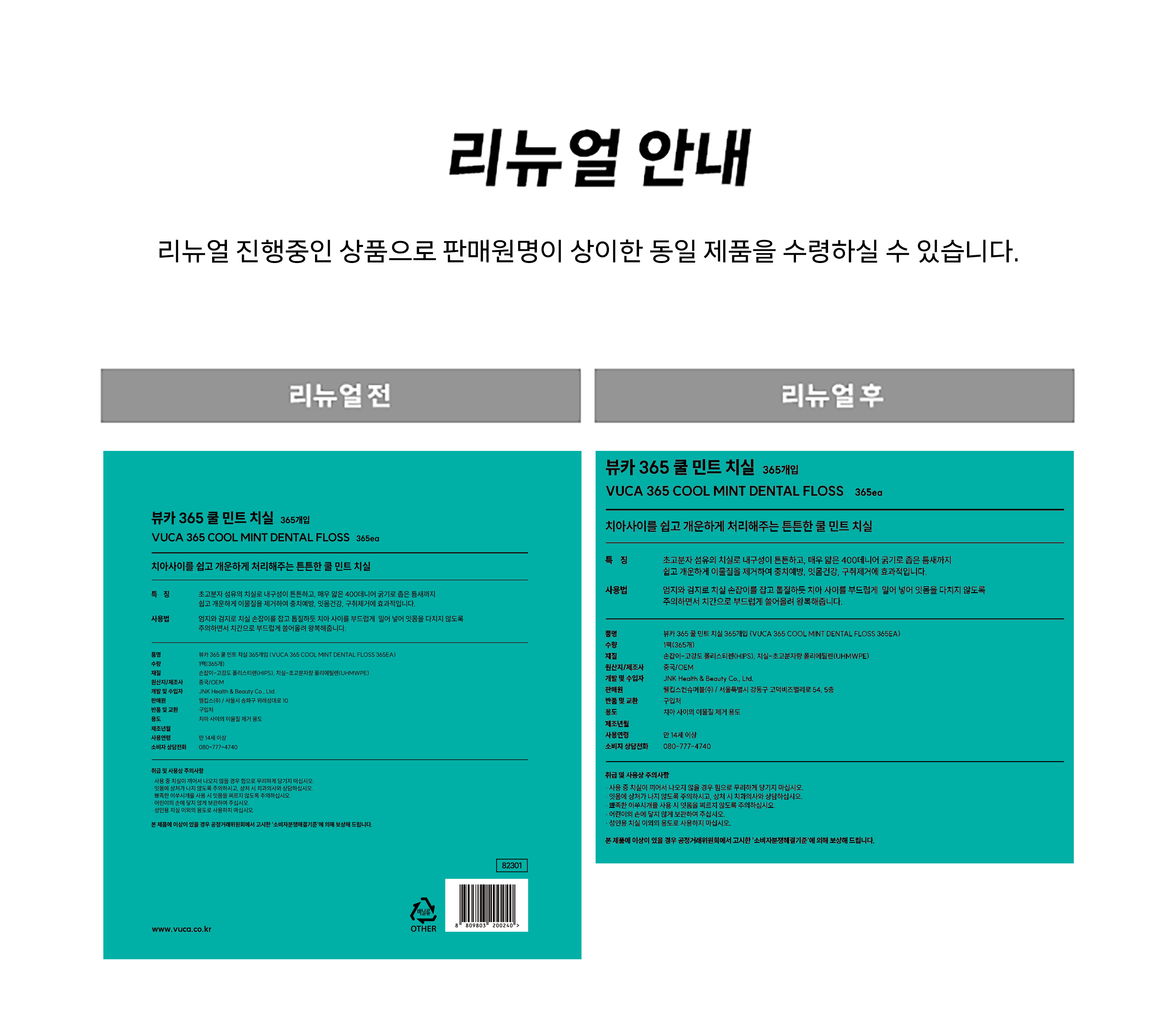 | 품명 및 모델명 | 뷰카 쿨 민트 치실 | 인증/허가 사항 | 해당없음 |