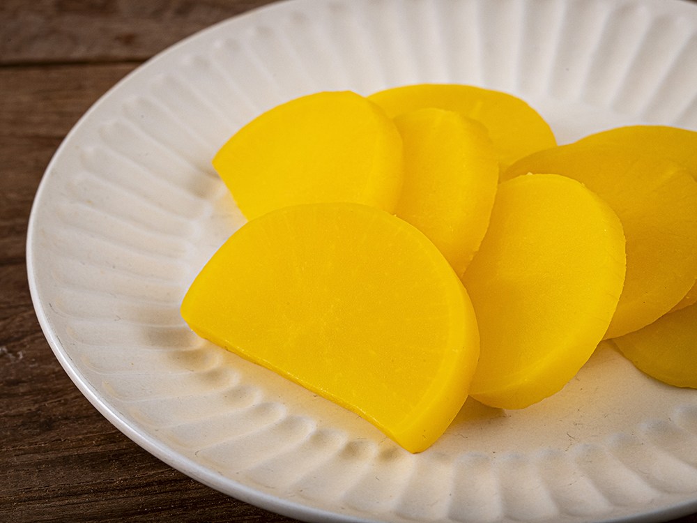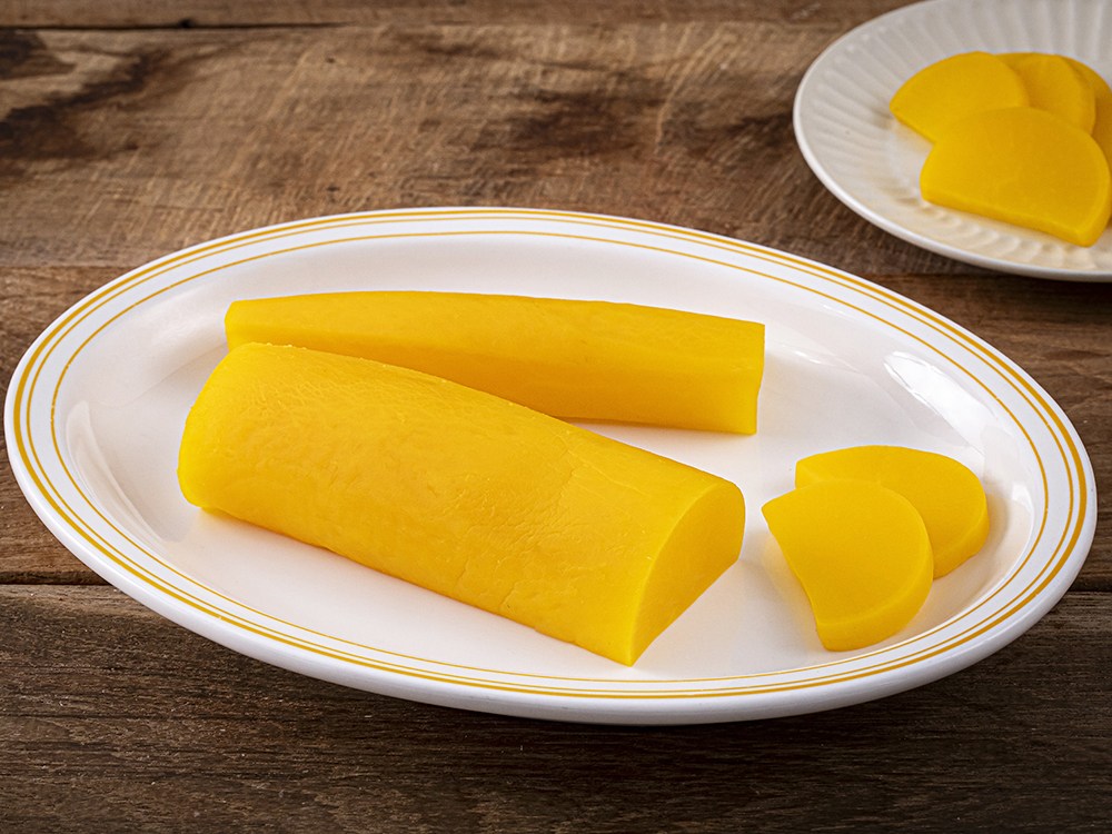 반달 모양으로 자르기 좋은 이절 단무지예요. 새콤하고 달짝지근한 감칠맛으로 입맛을 돋우지요. 한입 베어 물면, 아삭하게 씹히며 경쾌한 소리를 낸답니다. 원하는 두께로 잘라 라면, 떡볶이, 짜장면 등 다채로운 요리에 곁들여보세요.