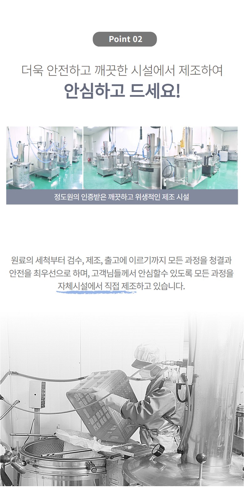 | 생산자 및 소재지 | 정도원 농업회사법인(주) / 경남 산청군 금서면 친환경로 2462-18 | 제조연월일, 소비기한 또는 품질유지기한 | 30일이내 제조 / 제조일로부터 2년까지.( 소비기한 :제품옆면하단에 표기) |