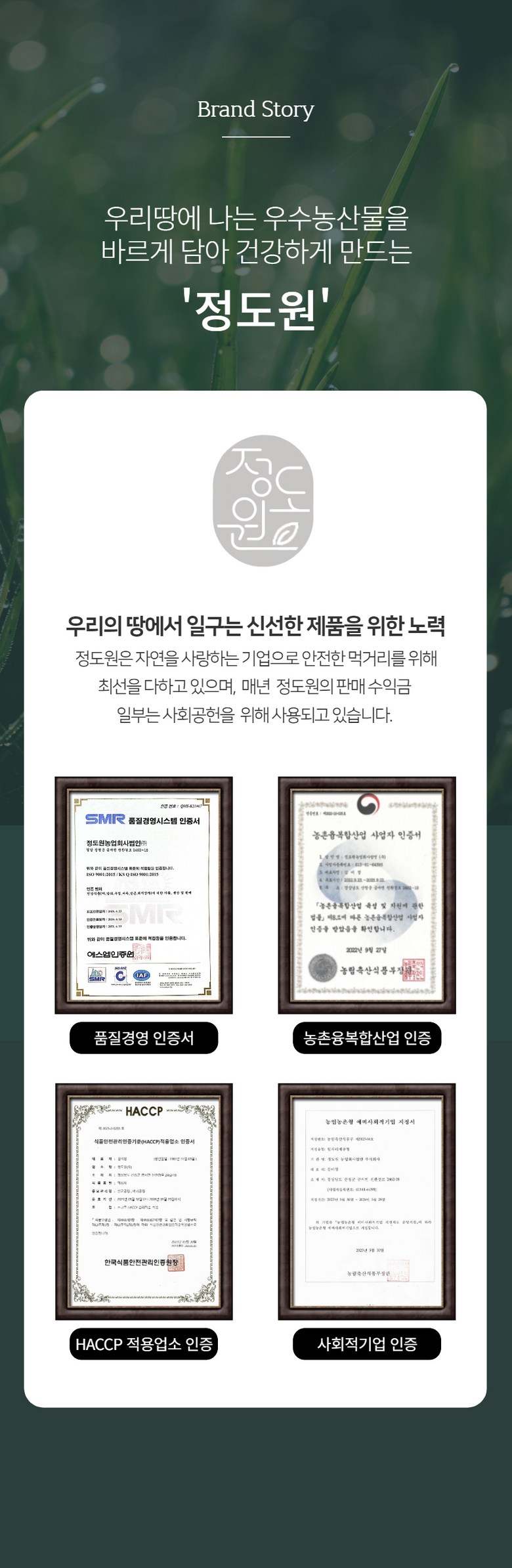 상호/대표자 | 정도원농업회사법인(주) / 김미정 | 사업장 소재지 | 경상남도산청군금서면매촌리 1290-1 |