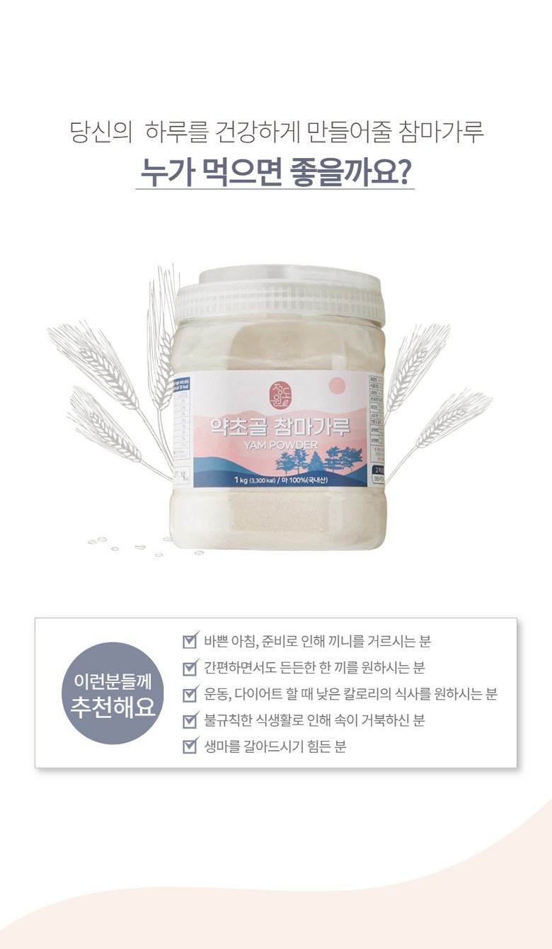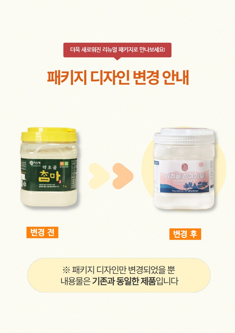 | 포장단위별 내용물의 용량(중량), 수량 | 1kg (1통) / 460g (1통) | 원재료명 및 함량 | 마 (국내산) 100% |
