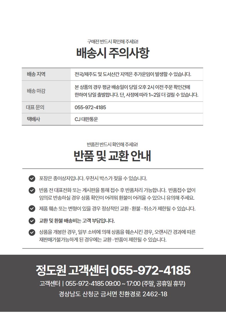 - ㆍ모니터 해상도의 차이로 인해 색상이나 이미지가 실제와 달라, 고객이 단순 변심으로 교환/반품을 무료로 요청하는 경우
