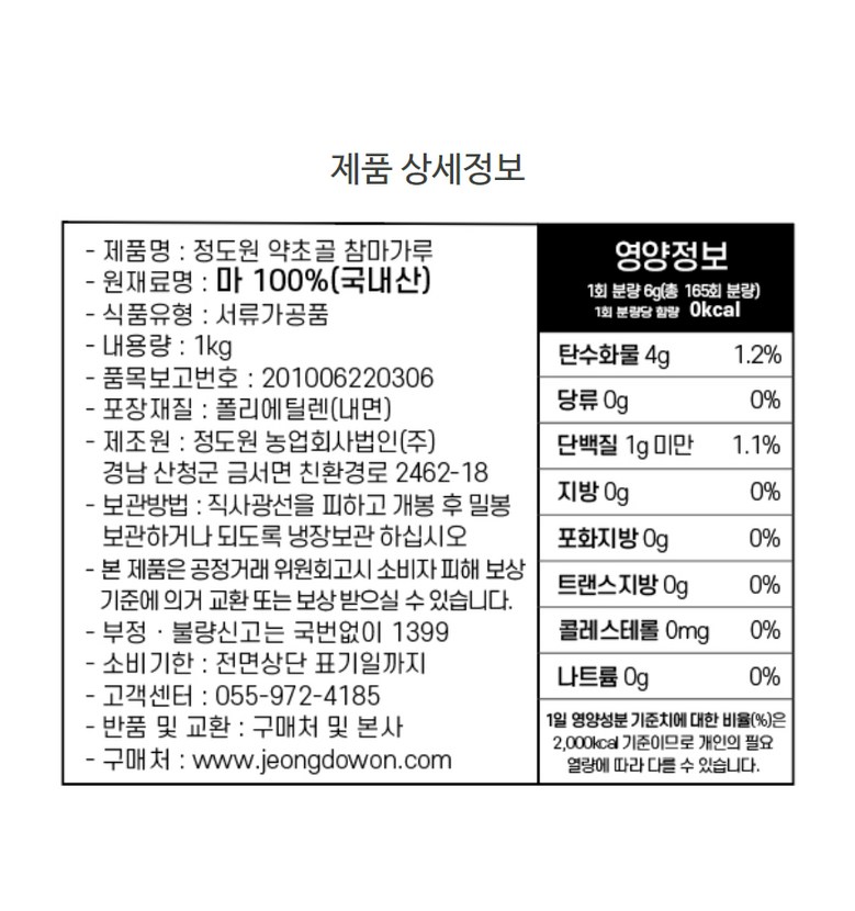 | 제품명 | 정도원 약초골 마가루 | 식품의 유형 | 서류가공품 |
