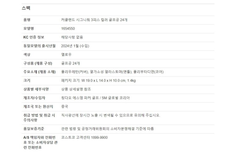 | 품명 및 모델명 | 커클랜드 시그니춰 3피스 컬러 골프공 24개 | KC 인증정보 | 해당사항 없음 |