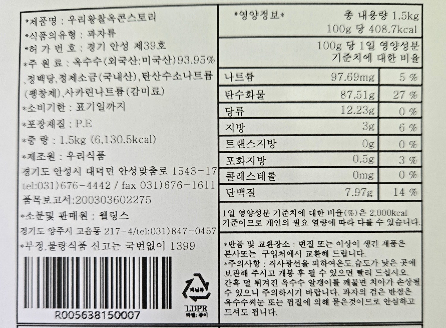 | 포장단위별 내용물의 용량(중량), 수량 | 1.5kg | 원재료명 및 함량 | 컨텐츠 참조 |