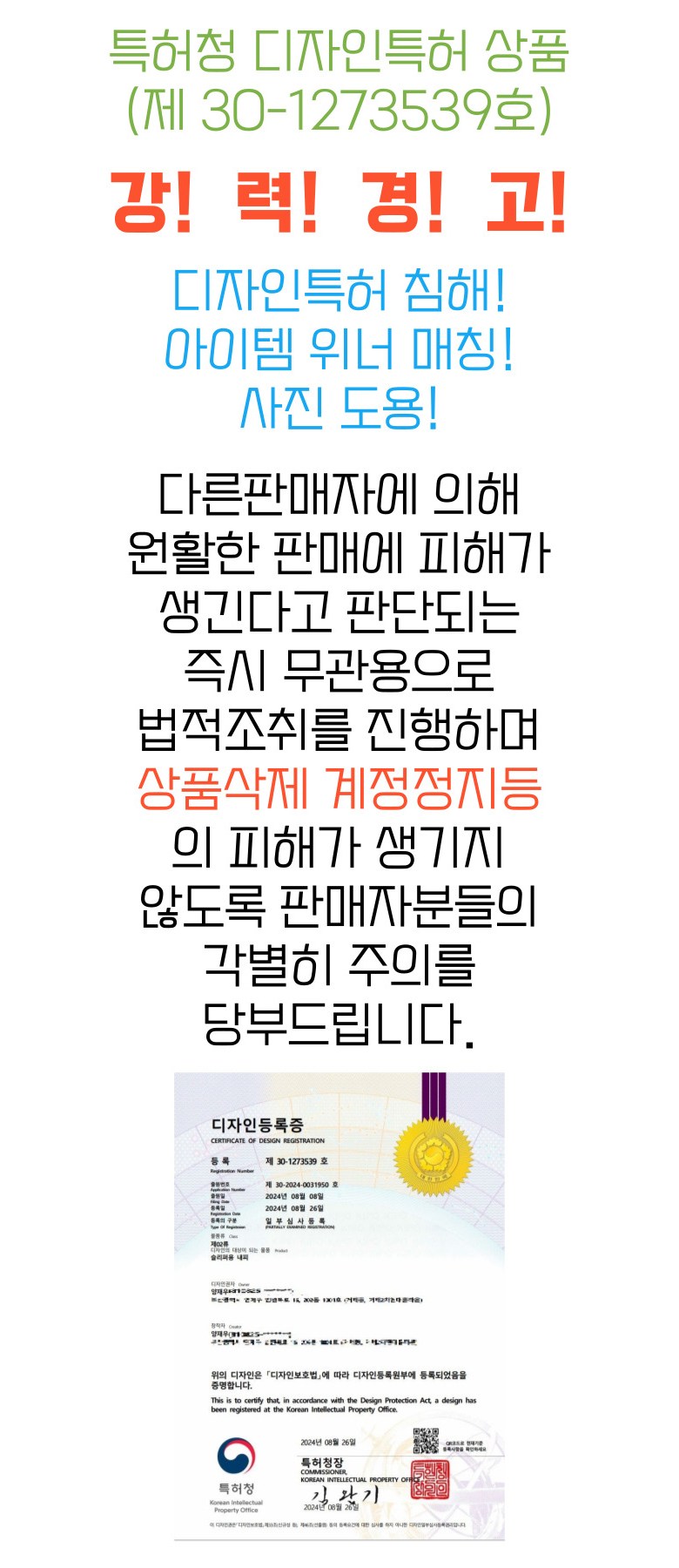 판매 부적격 상품 또는 허위과장광고 및 지식재산권을 침해하는 상품의 경우 신고하여 주시기 바랍니다.