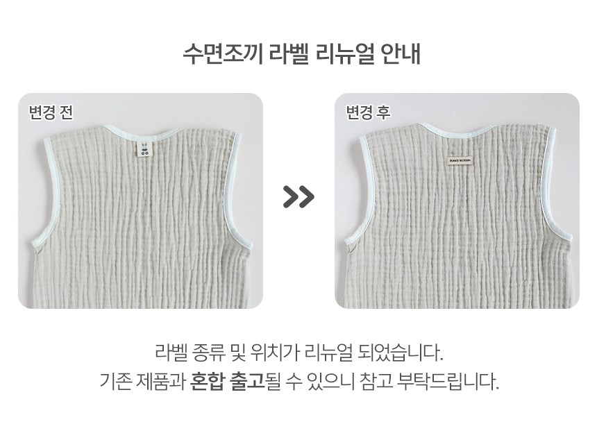| 품명 및 모델명 | 바니블라썸 유아용 3중거즈 수면조끼 | KC 인증정보 | 리뉴얼전: CB014H193-9003, CB014H519-1005 / 리뉴얼후: CB014H659-4005 |