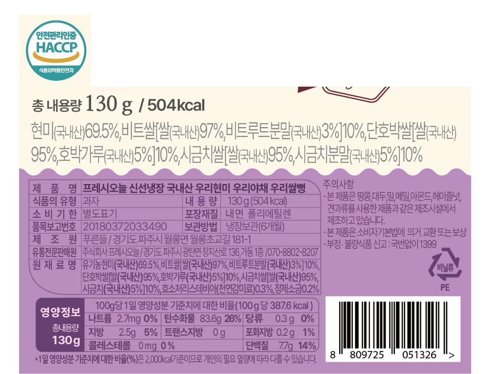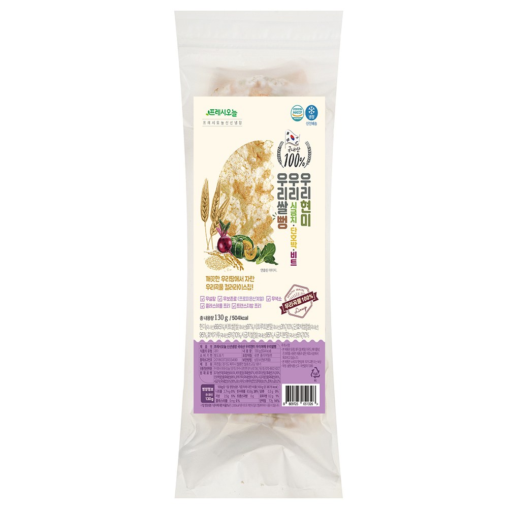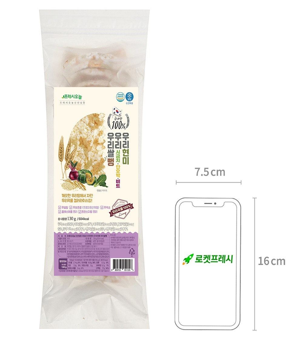 한 번 먹기 시작하면 끊임없이 먹게 되는 뻥튀기. 담백한 풍미와 은은한 단맛이 좋아 자꾸만 손이 가는 과자죠. 프레시오늘의 야채 쌀뻥튀기는 비트쌀, 단호박쌀, 시금치쌀 등을 사용해 만들어 향긋한 감칠맛을 더했답니다. 특유의 바삭바삭한 식감은 먹는 재미를 선사할 거예요.