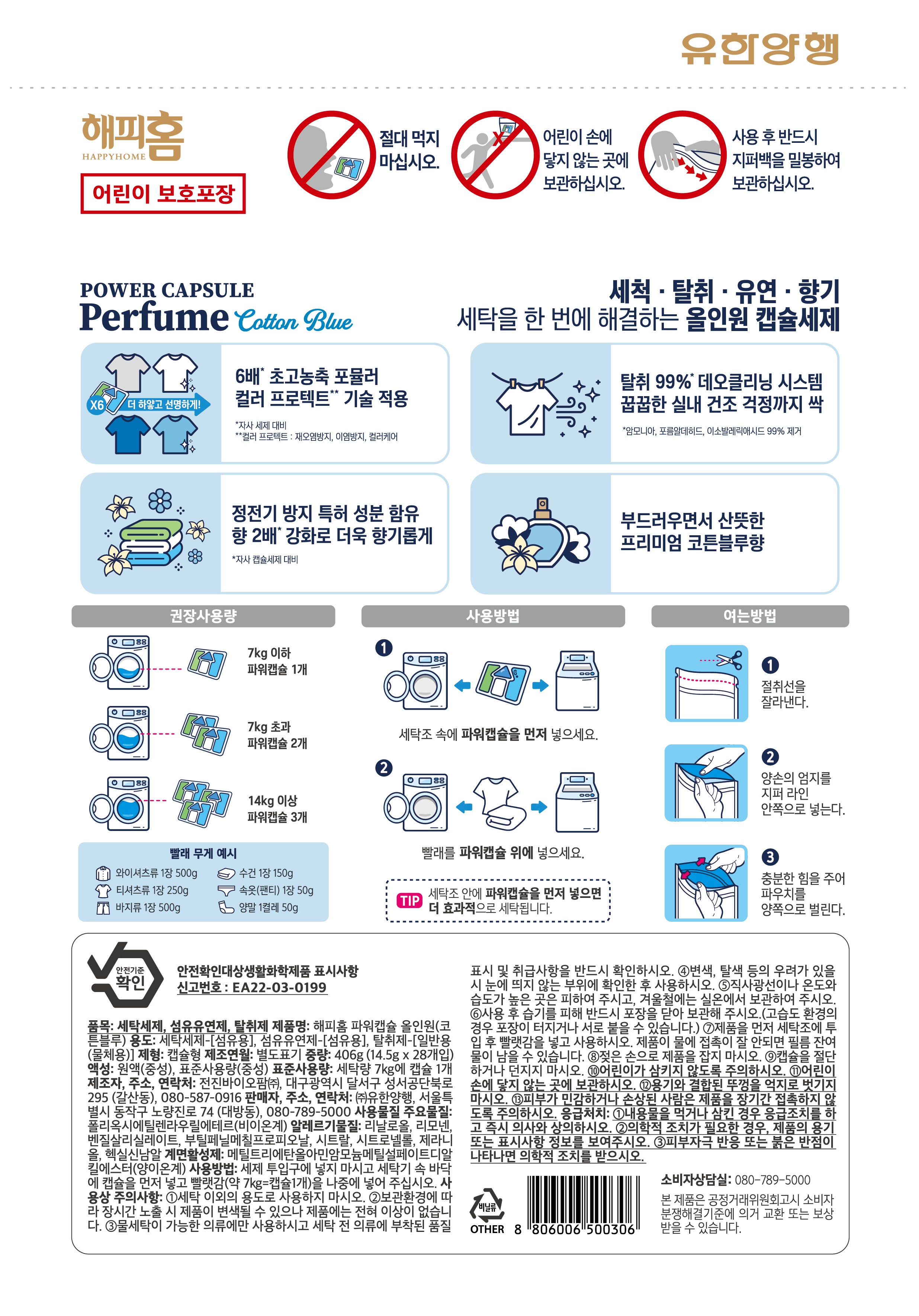 | 품목 및 제품명 | 세탁세제, 섬유유연제, 탈취제 / 해피홈 파워캡슐 올인원(코튼블루) | 용도(표백제의 경우 계열을 함께표시) 및 제형 | 세탁세제-[섬유용], 섬유유연제-[섬유용], 탈취제-[일반용(물체용)] / 캡슐형 |