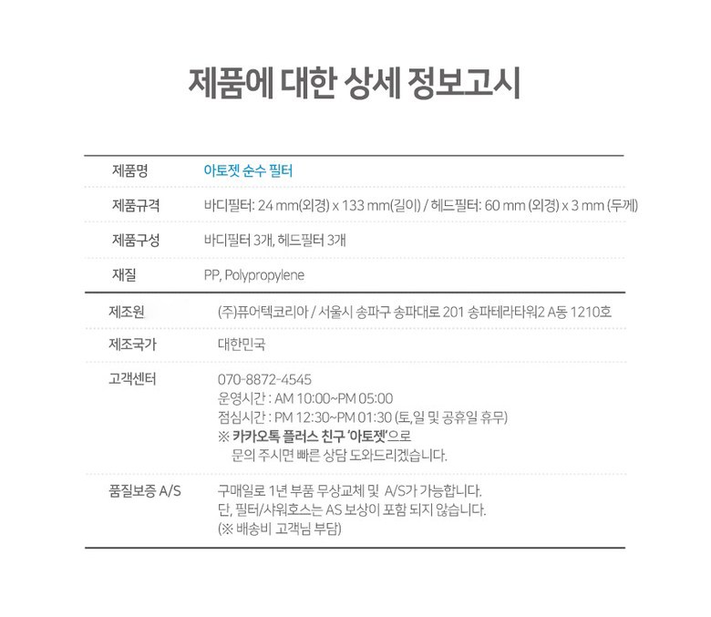 | 품명 및 모델명 | 아토젯 순수필터 바디필터6p+헤드필터6p | 인증/허가 사항 | 해당없음 |
