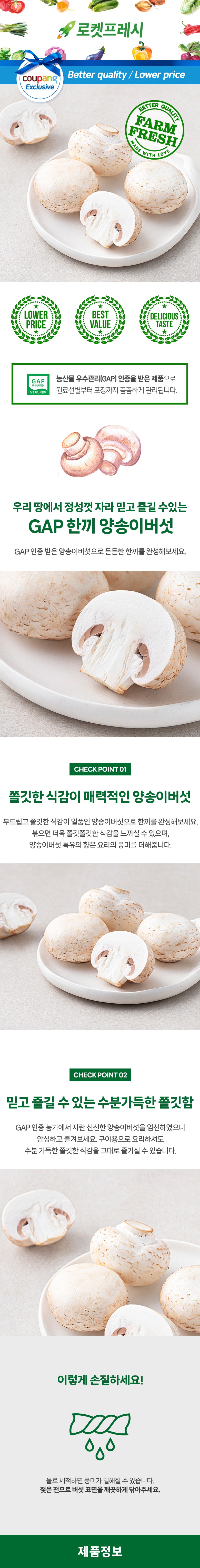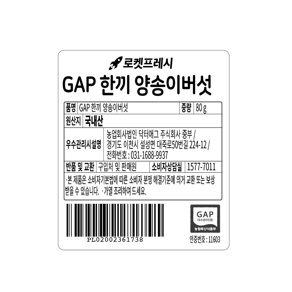 | 품목 또는 명칭 | GAP 한끼 양송이버섯 | 포장단위별 내용물의 용량(중량),수량,크기 | 80g |