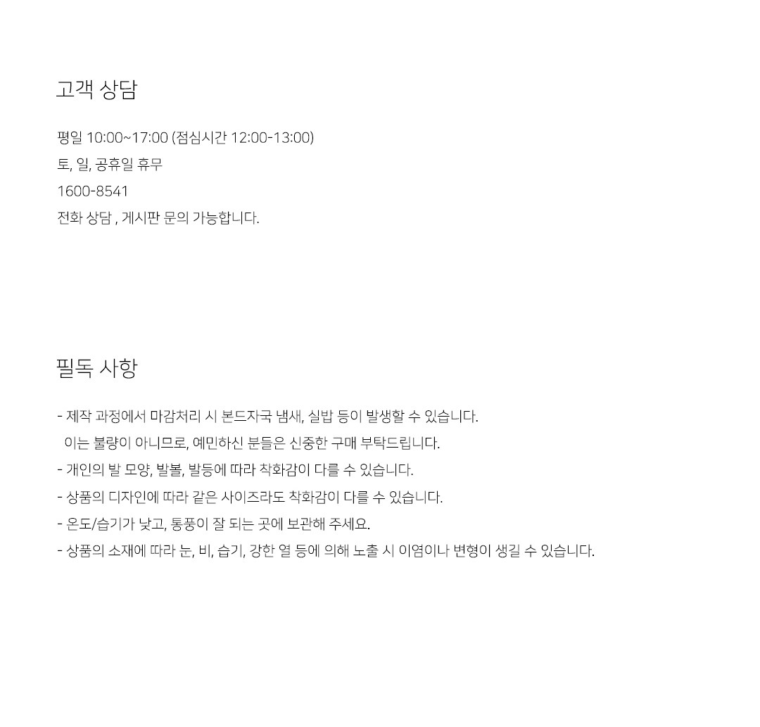 | 제조국 | 중국OEM | 취급시 주의사항 | 세탁이 가능한 제품에 한하여 단독 세탁을 하며 세제는 중성세제를 사용합니다. 신발이 젖은 경우에는 건조된 천 등으로 물기를 닦고 형태 변형 방지를 위하여 흰 종이나 천을 넣어서 통풍이 잘되는 그늘에 말려주세요. |