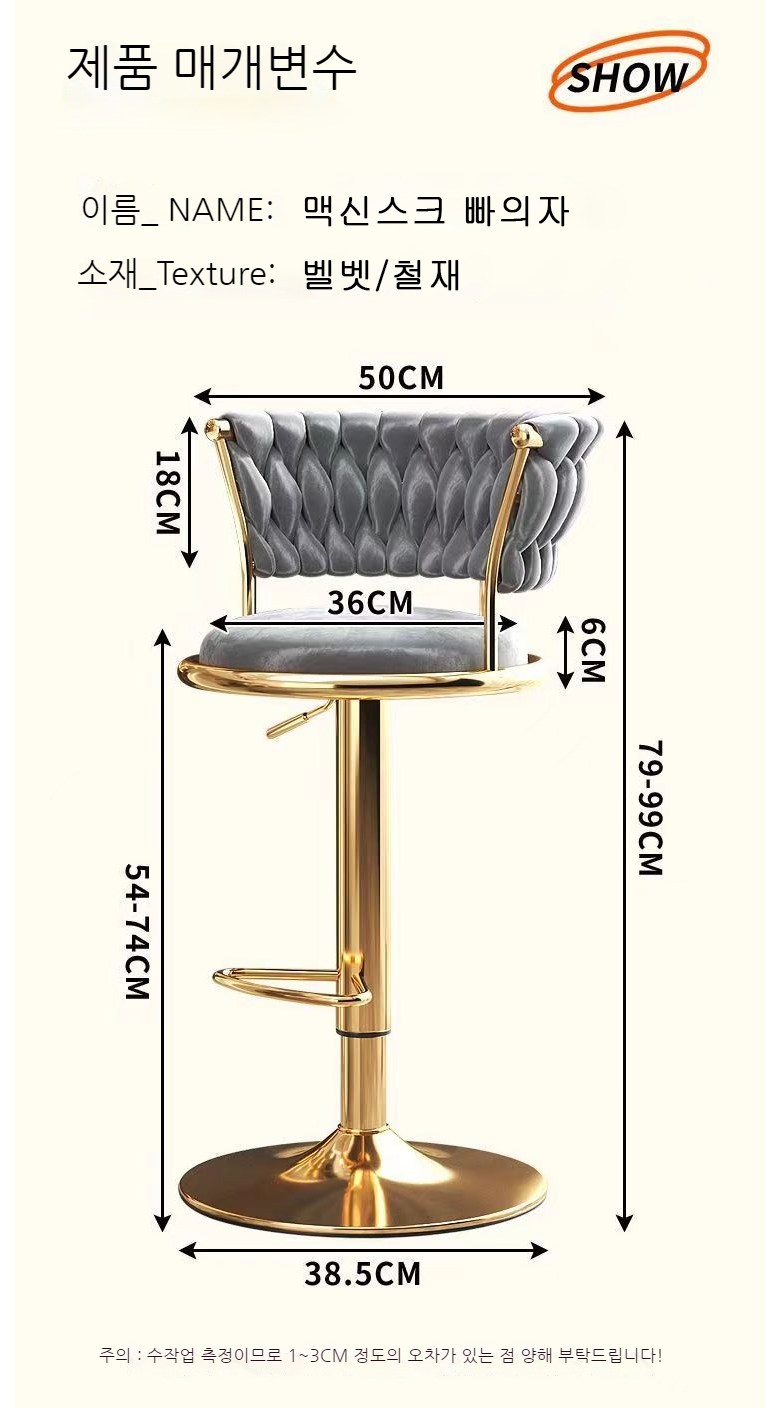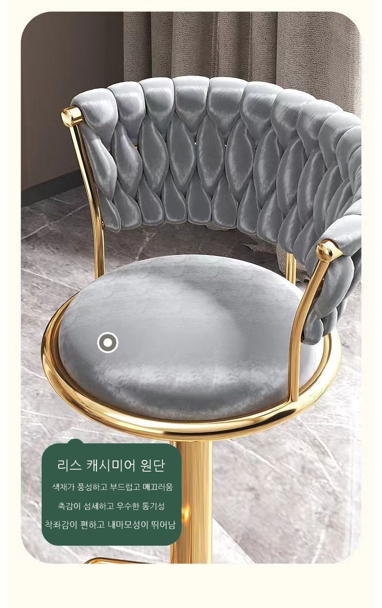 | 품명 및 모델명 | 포솜포솜 골드벨벳 홈바의자 등받이 빠의자 가정 주방 높이조절 바텐체어 아일랜드 높은 식탁의자 | 인증/허가 사항 | 상품 상세페이지 참조 |