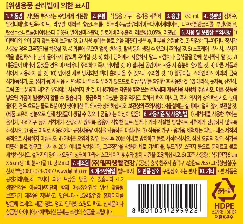 | 품명 및 모델명 | 자연퐁 뿌려쓰는 주방세제 레몬향 | 인증/허가 사항 | 위생용품 |